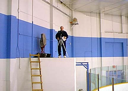 FTLComm - TisdaleDecember 21, 1998 It all started rather innocently with a camcorder six years ago with two boys playing hockey and a desire to capture their games on tape. The original attempts were boring and just catching a few plays didn't get the feel of things so it was decided to shoot the whole game, but that too was boring, commentary and play by play was added and there was a story and the we have closets of tapes from season after season of games. With the sons no longer playing, the passion for the game remains and Timothy Shire still gets out and records a game when ever some one wants one. From a perch atop the zamboni room |