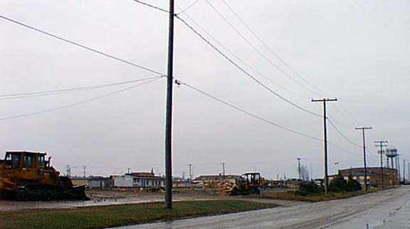 | Work is progressing nicely on the construction of a new SaskPower substation as we can see below two fellows up a pole in the rain Saturday afternoon. | |