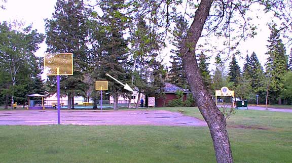 mainstreet than taking her chances with preditors along the river bank. Last year she located her nest across the street in a carrigan hedge a block to the East and did not seem to mind the attention she and her family got as strollers would look in on her from time to time. This year she chose to make her nest beside the little buidling beside the paddling pool, on the East side. Julie Beaudette's picture above is looking from the East side of the park as she was over in Julie's yard picking up a quick lunch. Late yesterday afternoon I was a block away on the West side of the park and watched as two curious children looked in on her and her brood. Julie says that she had nine eggs but due to some misadventure with some children she is nesting seven. As I took this picture two ladies on their evening stroll we on their way over to just take a peek and see how she was doing. At first one would think it pretty strange to set up a nest in a children's playground but consider the dangers down by the river. In the playground though there are children around there are no fox or skunks looking for duck eggs, dogs do not run around free and despite the noise of onlookers there is little to worry about. Down on the river bank their are a wide range of wild and semi domestic preditors who would make short work of a nest of nine eggs. So all in all she has decided to take her chances getting the waddlers across the street and over to the river when the time comes. In the mean time she just has to put up with the tourists. |