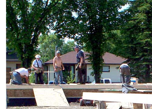In the picture above you can see the floor joists are ready to be installed and in this last picture taken a few minutes after the one at the top of the page the work crew have the floor in place and are getting ready to begin assembling the structures walls.