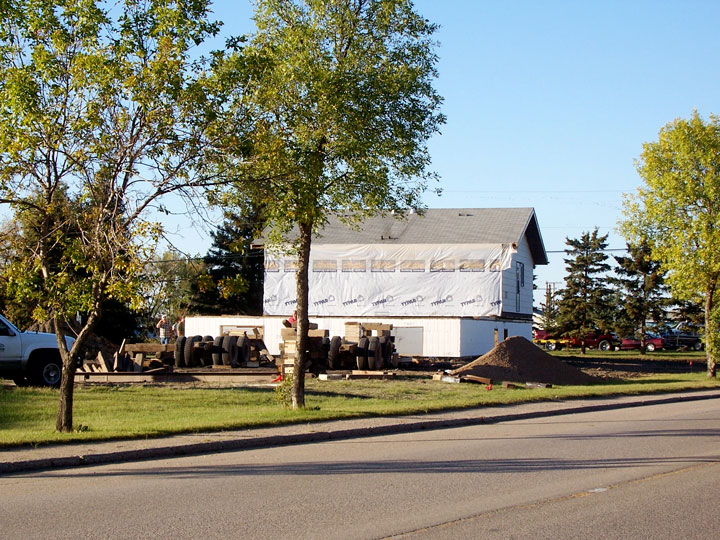 At this time it is not known as to where the building was transplanted nor is it clear if it is a duplex or a four plex. With the street closed on the north side and the east side of the site being main street it was just not possible to stick around and ask the questions that need to be answered. In the picture below you can see the one half of the structure in place looking at it from the south with the moving dollies about to be removed. This project will have the two halves mated together and sharing the basement by Friday when we will try to answer some questions.