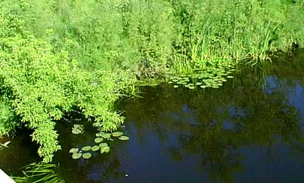 this picture the water lilies floating in the stream and the trees reflecting off the surface combine both the real and the illusion that makes this an interesting habitat. For most living things that live in this microcosm this is the whole of their universe. This is their place, all that is, is right here about them. Imagine the view of this world as a frog, a turtle, a snake, a dragonfly or a wessel. A place in harmony and conflict full of adventures and almost self contained. The large animals like the deer, fox and Buteo hawks are as much intruders into this world as we humans who |