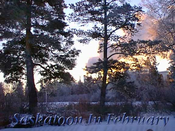 this unobstructedview. A modest fog over night had decorated much of Northern Saskatchewan Saturday and in these pictures you can see the frost on the trees. This magnificent example was in a Park far up along the river and seemed like a really big sparkling gem as the ice crystals merge in the brilliant sunlight to produce a single entity. This park area was experiencing a steady flow of people as they jogged through on the cleared pathways, walked along with their dogs, or were on cross country skis, enjoying the gentle rises and falls of the river side trails. Only a few hundred feet from a series of town houses and condominiums, only a couple of vehicles were in the small parking lot, as most people simply walk across the street into this great recreational area. "What is that noise?" I asked this lady sitting on a park bench. "Oh, its just the city." she replied pleasantly, " highways, trains, cars, there are no factories or anything in this area, just the city." |