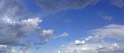that of vertical where they would then be described as a funnel cloud or tornado. The panorama below is a very interesting one because it actually reveals more about the turbulent weather then was apparent as one looked around. In this image you can see all of the elements of minor showers from "virga" the trailing precipitation that is falling from a cloud but is not reaching the surface to all the remnants of showers that are over and those that are about to occur. This vertical development is drastically restricted in height because of the very cold air in the upper atmosphere which prevents the grand and potentially dangerous Nimbus clouds with their anvil appearance. Because the camera was angled upward to make these twenty-seven pictures that make up this panorama (QuickTime is required to see this image) the horizon is distorted in many locations. Remember to use the "control" key to zoom out and the "shift" key to zoom in to see the scene from different perspectives. To move around the sky just use your mouse. This panorama was shot just West of Tisdale and to orient your self, you are looking due South before you move the image but if you get lost the close bunch of trees between the Tisdale Alfalfa Dehydration plant and the van is almost due North. |