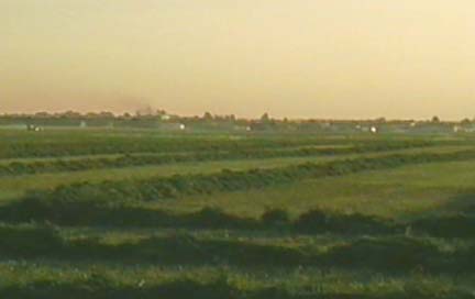 Dehydration there are several over twenty year old Hesston machines. In the picture on the right we can see two dragonflies patrolling an alfalfa seed crop. The regular alfalfa contract runs for three years of harvesting and in the next year the crop is grown for seed. There is an excellent market for alfalfa seed as it actually returns higher profits then when used for pellets or sundried cubes. Those fields being used for seed production are marked with the bee huts. Bees are used in these fields to increase the pollination process. |