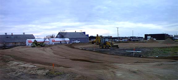 to prepare for construction.Meanwhile on the lot beside the cardlock site there are some materials laying around, it is hard to tell if these are Dairy Queen parts or Coop parts set aside until they can be placed in their appropriate location, my guess is the latter. |