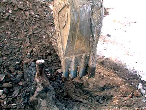 ![]() An excavation like this at this time of the year is not a small undertaking since the line will have to be shut down for repairs to be carried out. This meant that the actual repair work would be delayed until after school closes this afternoon when they will shut the line that supplies all of Caribou Crescent down and carry out the repairs to the line or value. Unlike last year when digging was completely unimpeded by frost this year the frost is more than three feet deep and the back hoe fitted with this special frozen ground cutting bucket has to bit by bit cut open the ground. This process is very hard on the special teeth on the bucket and after yesterday's and today's dig these teeth will have to be removed and replaced as they will have worn down. As of right now (3:30) the water has been shut off and repairmen are down in the hole working on the problem. |