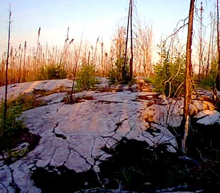![]() There is a hiking trail from Nutpoint that reaches into the area burned over in the forest fire that threatened La Ronge in 2000. Forest fires are a natural and important part of the way things go in Canada's forests and as you can see from these pictures life indeed does go on and renews itself. The trees and all other plants much live in the smallest amount of soil as the bedrock outcrops four billion years old form the ground. |