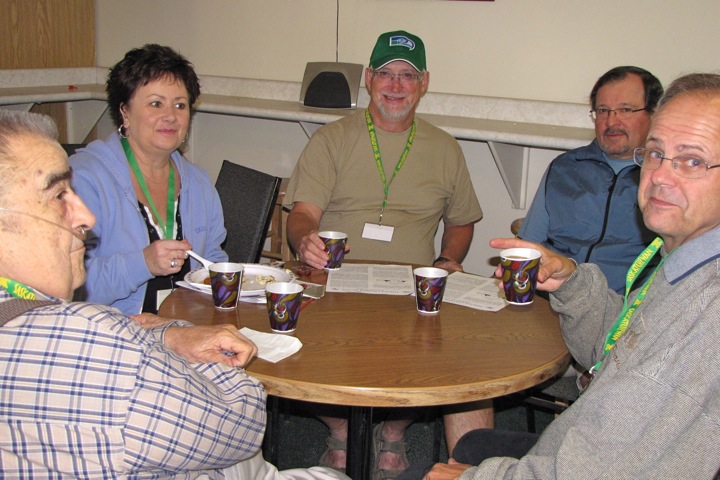 Larry Salamon, Lorna Manson, Bob Price, Bill Zorn and Richard Hildebrand are enjoying the time to visit.