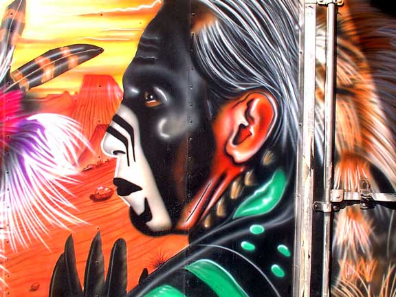 ![]() The Pow Wows of today are extra ordinary commercial events. Performers travel all across the continent to perform for prize money and tourists, Indian and Non-indian alike, come out in droves to see the spectacle. At the bottom of this page are a series of sites I suggest to take a look at that will tell about the competition categories and tell of the locations. But understand that Pow Wow are a contemporary form of show business Certainly the dances, the "banging and yelling" (my term for the accompaniment) and the basis for the costumes themselves are based in tradition, but you must also remember that the people of North America are an extremely diverse lot and the format of the Pow Wow homogenises the difference to blend into a growing present day culture. Kevin and Debbie Thomas were on their way home to Leoville Monday afternoon after having spent the weekend at the Pas Pow Wow. We spotted their trailers at the 7-11 and stopped to photograph them and talk to them about the artwork. Their company Cree Nation Consulting and Four Seasons Catering (306 984 4444) |