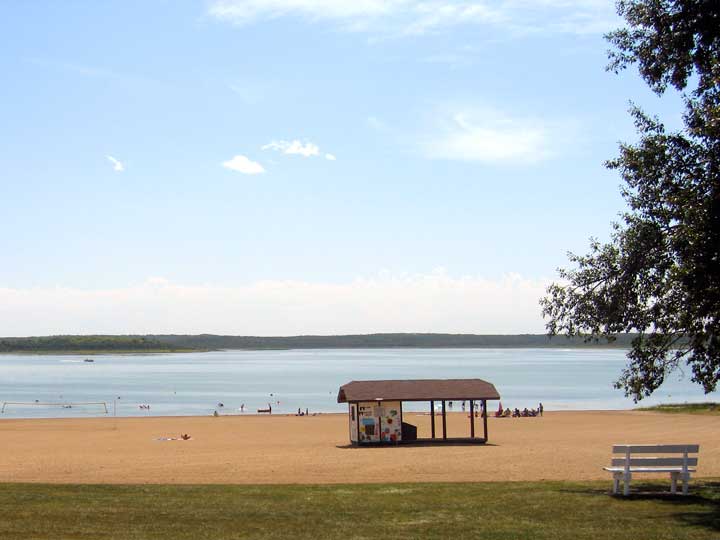 Above is the outstanding beach that was always the main attraction at Kenosee. Learning to swim there or chipping a tooth on the slide all were a part of life. On the right looking from the main beach is what once was "Hog Island" which now is no longer an island as the pitiful shrunken lake is perhaps about half the size it was when I worked at the park store just up the beach.