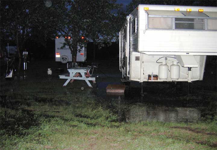 Nature tossed us a nasty storm Friday night and flooded our camp site. Notice the flooding below that was a big storm with hail and much more rain than expected.