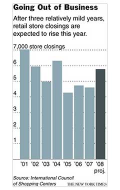 The International Council of Shopping Centers, a trade group, estimates there will be 5,770 store closings in 2008, up 25 percent from 2007, when there were 4,603.