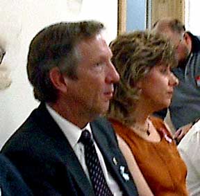River Valley constituency). Mr. Calvert opened his remarks by paying tribute to his long time fellow cabinet minister Andy Renaud. Both men had soldier through many difficult issues and also had the responsibilities of their cabinet positions, so there was clearly a strong bond between them, a bond shared by the people at the meeting. As part of the setting for his speech he echoed the comments made by Mark Pitzel when he expressed his appreciation for the continued support by his wife who was with him at this meeting tonight (right). He quipped that Tommy Douglas had once said that he was on the road so much and away from home so often that he and his wife were considering adoption for their second child. |
