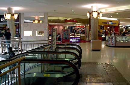 of the edifice that now stands in front of this escalator.The food court is a confusing sort of fast food thing found in every larger mall. I had spent almost $10 on stuff that might have been food and was gazing back with the $1.13 cookie stand just off the right of this scene and the clerk in the jewelery outlet staring vacantly between two signs. This to me says something about this mall and the mall experience. It had potential and may still have potential but it just might be that its hayday is over. |