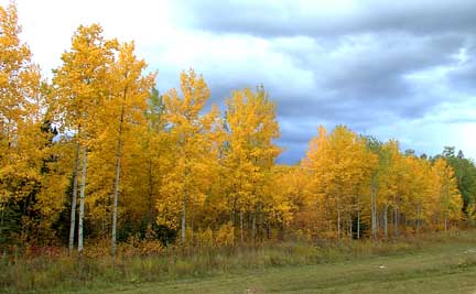 ![]() awareness even of some thing that we have seen as a species year after year and yet still have so little comprehension on the process and implications. While some stands seem gold some are pure yellow like this one which had leaves so pale as to almost white having lost all the carbon converting chlorophyll and moved to another dormant stage of existence. Clear of the forest I could look South along its edge and see the clear signs of approaching weather the sort of weather that brings with it cold temperatures and geese gathering in flocks to head South, weather that brings rain and as the temperatures continue to descend frozen water that will cover the land for six months, global warming or not, as winter will grip this land once more. |