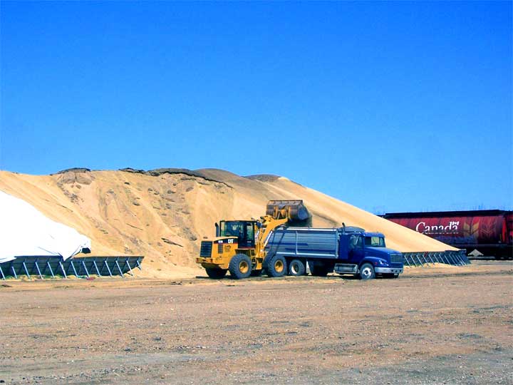 For the second year in a row the Louis Dreyfus inland grain terminal filled to capacity its outdoor storage pile during last year's harvest. A pile like this one has far more that 200,000 bushel and the quality of last year's harvest was outstanding so this is a very valuable asset. A couple of weeks ago serious wind damage occured baring the eastern portion of the pile and as a result you can see some discolouration on the top of the pile from the damage which include light rain and snow. But, today this truck (below) was cycling back and forth moving the pile to the terminal and into a whole train of cars waiting to be loaded. |