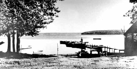 In the early ‘50s, it was moved to the Peninsula, then across to its current location in the ‘60s. I have a photo of it on the main beach, but not much of the building is visible. A photo of it on the Peninsula shows it to be about the same size as the current one, but it had a pitched roof. My photo shows Ed Norgrove’s old Jeep parked by the building; the Peninsula is almost flooded, but I can see a vehicle parked out farther, so there must have been some high ground. That must have been 1954, an awfully wet spring and summer. Somewhere around I have a photo of the walking bridge with both ends in water! Merv tells me the peninsula and west of the Marina were low, marshy areas. The campground was where the parking lot beside the Beach Cafe is now. Before the Marina was dredged out and the Island built, clay was hauled from the Ball Diamond to build up the low areas. That explains that ridge along the west side of the Ball Diamond. | ||||||