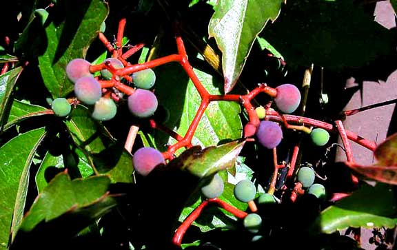 I noticed, (for the first time, I think) that Virginia creepers have berries; they start out dusty green and redden later. Pretty, but I don’t think I will try eating one. | ||||||