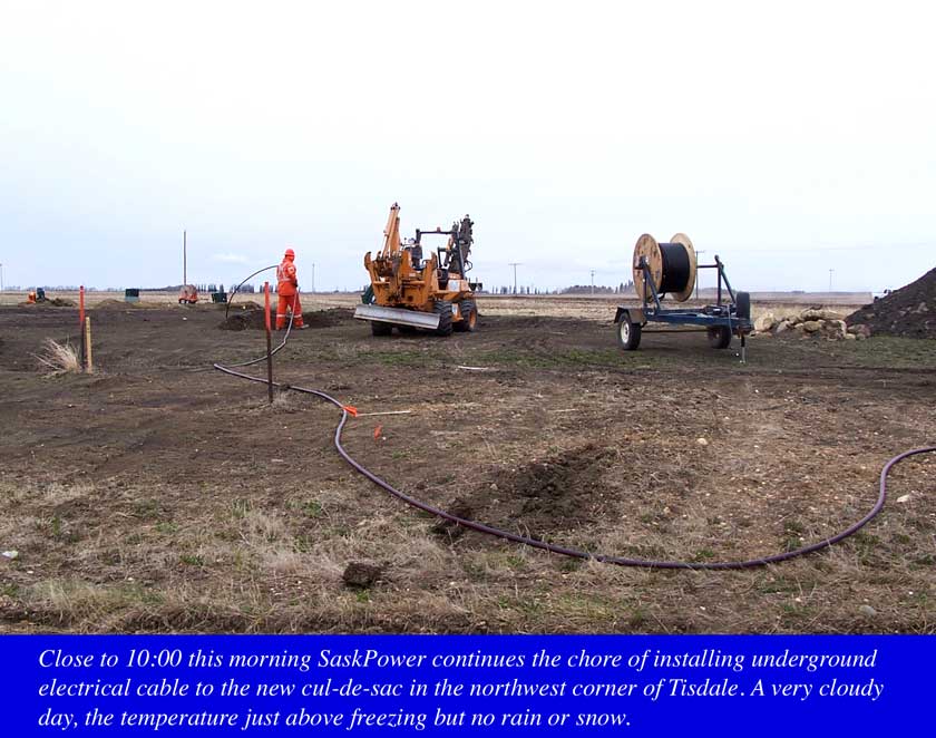 Tisdale: Two new basements were begun on Monday making it four new houses for this year around the new cul-de-sac, Forester and Newmarket. SaskPower working in the same area putting in underground electrical service and contractors going flat out.