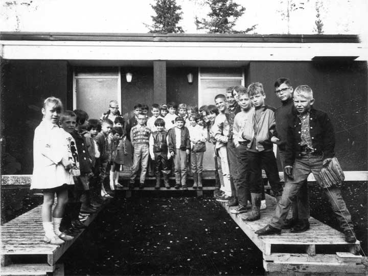 It is forty years since my wife and I began our life together. We were married in the summer of 1968 and after our two week honey moon we packed up our things and drove off to northern Alberta. I was the new principal for Rainbow Lake School and Judy was the teacher for grades three and four. the school had opened in January of 68 and we were the second couple to work in the school which was really a set of ATCO trailers. At the bottom of the page is how the students looked one of the very first days of school in September 1968. That's Aaron Eklund on the right at the front but unfortunately Kevin is not in this picture which was just shot one of the first mornings of school in September 1968. I did not take the picture below of Kevin that same year, as he stands in front of the Banff Oil's Fairchild 27 that provided the community with a direct link to Calgary.