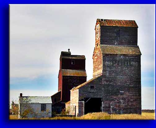 Two old grain elevators about five miles East of Wakaw Sk on Highway 41. I can barely read the lettering on one (Saskatchewan Wheat pool). This was a hamlet (name unknown) and everything including a house has been vacant for many years.