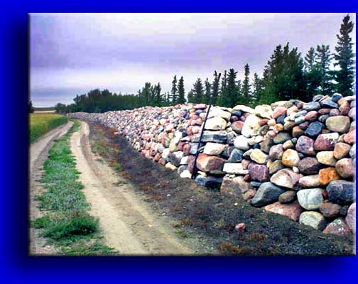 Stone wall (nearly 1/2 mile long) is one mile west of Smiley, Saskatchewan and was built starting in 1962 by Albert Johnson. I estimated that in some places - this wall was nearly 12 feet high and 20 feet thick. This wall has no mortor was was buily by Mr. Johnson ( now deceased ) as a hobby. The Johnson farm occupied by Mr. Johnson's son is on same road and before one gets to the stone wall. A 'visitors welcome' sign is in front of the farm. The tall trees, landscape, the man made creek, the fishpond etc. are also well worth seeing. Why travel to Greece, Rome or Stonehenge when you can see something just as good right here in Saskatchewan ? |