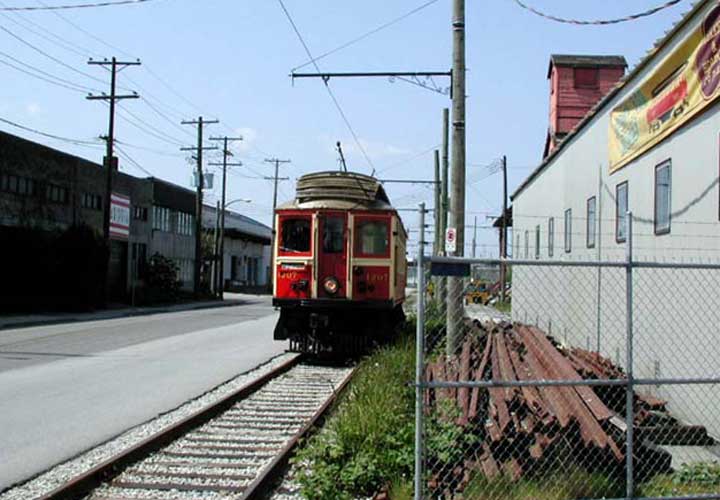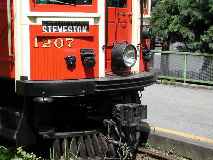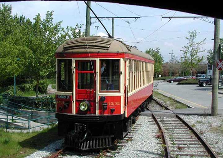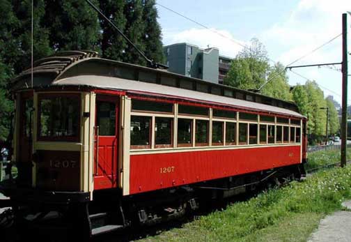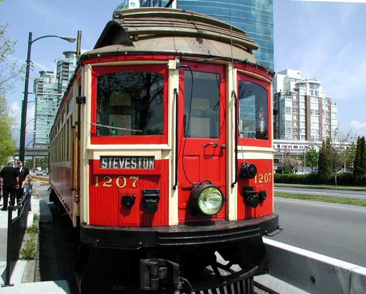 ![]() interurban cars. Volunteers from the group run them on holidays and weekends on a 2.8 km line from Science world, at the end of False Creek, to Granville Island Market. Car 1207 was built in 1905 by The B.C. Electric Railway Co. at the shops in New Westminster. It served the Steveston line from downtown Vancouver through Richmond farmlands to the canneries at Steveston on the Fraser River. This is a wooden-sided car that was retired from active service in 1958.1231 is a 35-ton steel-bodied car built by the St. Louis Car Company in 1913. It carried up to 65 passengers on the Burnaby Lake line between Vancouver and Sapperton. |