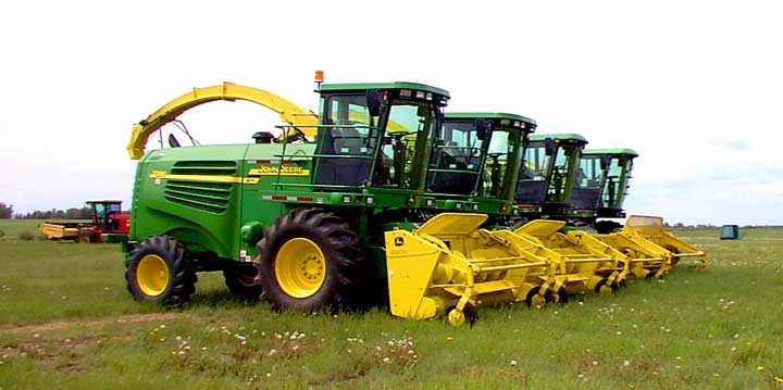 This year the first field is North of the plant. Though many fields were ready last week those were spotty and they delayed harvest operations until they had enough fields ready to sustain continuos operations as it is desirable to have to start up and stop the dehydration machinery. But the time has arrived for sustainable processing and tomorrow the harvesters and trucks will be out in the fields as the heat will be turned on and the steam will rise signally a new year has begun. Two new John Deere harvesters were added to the fleet this year joining last year's two new machines.This year one of the trucks has been fitted with an experimental aluminum articulated cover. If it works out, the tarp covers will be gradually replaced with the new aluminum covers fabricated by Tisdale Alfalfa Dehydration in their own shop. The swathers are working in the fields together while two machines will move into the fields soon as they work independently doing those fields that the product will be processed as sun dried "cube" alfalfa which means the alfalfa will be baled. |