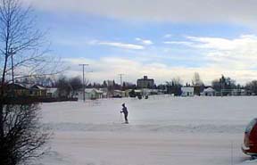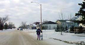| Above is what the melting snow on the streets looked like in downtown Tisdale Saturday afternoon. Above a lady takes her walker for a stroll and below left is a lady Friday afternoon doing a quick circuit around the football field. But for all the relief from the cold and imprisonment in one home or office was welcomed as we can see a group of shoppers below right with their jackets open and gloves off. The next page is a picture of three boys finished with their sliding on the hill behind the hospital and heading home after an afternoon of fun. | |