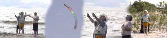 ![]() beaches with their dunes and waves. But the beach and its wind is the ideal location for kite flying in the composite image above my sons entertain them selves by having their dad take a shot at flying one of their parafloil kites. (I'm the guy with the hat.) This family has had their day in the sun and are about to head home. Notice the fine sand which makes you think of snow shoes as everyone trudges along up to their ankles in the stuff. |