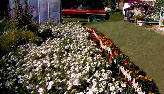 ![]() lady explained, "But it looks they were all white." The border closest to the house of marigolds provided the needed colour while the dark green and large white blossoms of these trumpets provided excellent contrast. Though there are flowers throughout the whole lot sized garden has a complete supply of vegetables but everywhere you look there are flowers. |