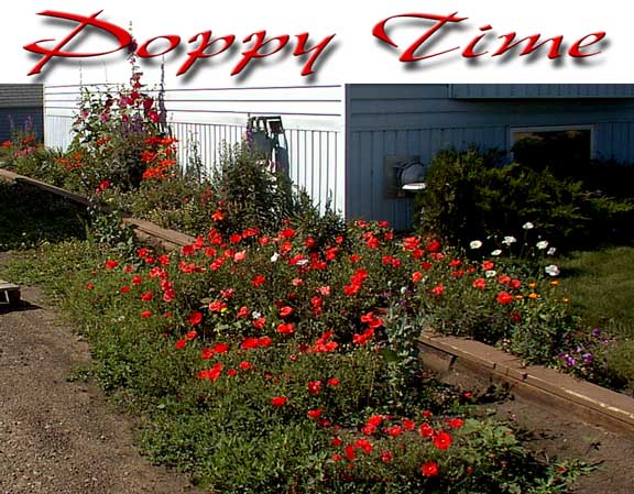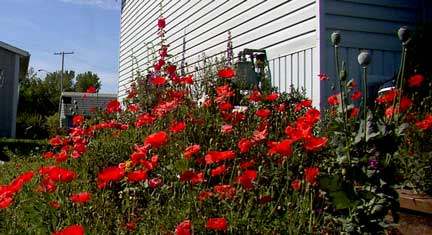 ![]() Poppies though only flowers have to be considered to have a high level of determination. Here we see them planted behind a boarder but happily volunteering in a tough gravel driveway. The intensity of their colour always astonishes me as they seem to be the very essence of "redness." Below we can see another view of this flower patch with some hollyhawks doing their usual upstanding job. |