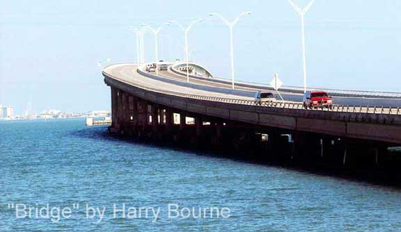Bourne’s photo of the sweeping approach to a bridge in southern Texas, and Darlene