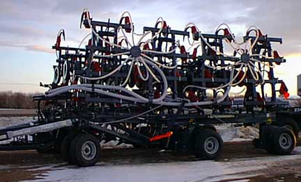 hitched on to it will alsosend him scurrying to find financing to make the purchase. The picture on the right and the one below it, illustrate the amazing development of continuous cropping and one pass over the field farming. These complex field trains till the soil, add fertiliser, seed and pack the ground all in a single move across the field. To achieve this efficiency the capital outlay in equipment is coupled to immense expenses for a massive tractor to pull the set up and then there is fuel and chemical cost along with the cost of seed. |