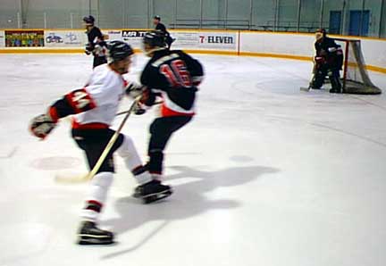 saw the Ramblers throttle the Knights 10 - 3.The Nipawin Knights had suffered a number of injuries and with their shortened bench were doing the best they could. On Saturday night they had some problems in the first period but dominated the second only to see the Ramblers pepper Kevin Lockwood (Nipawin goalie) punishing him with seven goals and a final score of 9 - 3. Lockwood was in net again last night and the Ramblers were in cruise mode. Combination plays, hot passing and relentless mastery of the Nipawin zone. |