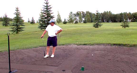 course the more costly it is to play.It is remarkable and utterly pure Saskatchewan to see what so many small towns have done with this game. Since land in Saskatchewan is not expensive, rural communities can find a pasture or quarter section and develop it into a golf course. Kelliher is only one of many small Saskatchewan villages that has developed a course that makes most golfers green with envy. The members of the Kelliher club have pitched in together to plant trees, maintain the fairways and in time produce a course that rivals the best. Allan Shire, seen putting here, and his friends have put years and years of energy and resources into their community golf course and unlike most places, golf in Kelliher is a family activity costing so little that everyone can participate. As we went along, a mother and her two ten or eleven year old boys with a hand ful of clubs were playing a neighbouring fairway and having a wonderful time. The only shortcoming between a rural community course like this one and the urban and provincial park giants is that here you must make do with sand greens. |