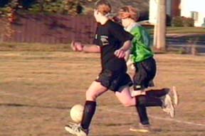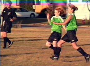 A Hudson Bay player puts the ball high into play with her head (below left) and the goalie makes a save.