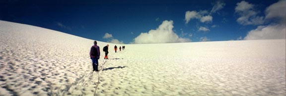 | Day 2 and I keep hearing a line from "Apocalypse Now" about how the 45 year old character played by Marlon Brando went "humping" his way through boot camp with people half his age. I am the oldest by at least 10 years with Andrea being the youngest. This old body is starting to break down already or at least beginning to rebel. First it is the boots that are so uncomfortable it takes a great deal of suck up the pain just to get around and now my knee has popped out during a hair raising self-arrest simulating a fall headfirst down a very steep slope of a mountain. When it happened the pain and fear was so intense I almost passed out. It was the resurrection of an old injury when a quad-runner ran over my foot and when I tried to pull my foot free, I popped the knee cap out of place. On this mountain there was enormous fear that I would not be able to get up and back to the hut. |