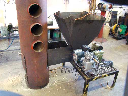 | One electric motor drives the compressor (The forced air makes a fire hot enough to make a clinker out of the wood chips!) and the gear and sprocket reduction down to .17 RPM to drive the 8" auger. |