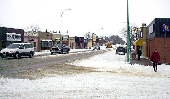 ![]() Most merchants have got to work and cleared off the snow from their walks but for a Saturday there sure were few people around. In this picture we can see Mr. Chupa doing some clean up around Groats and Mr. Lamb clearing his sidewalk around the hardware. The remarkable thing about this snowfall is that it is very wet and the temperature this morning and throughout the day has remained at or close to freezing. Even now as I tell you this story at 7:40 it is -3º which is pretty warm. Unlike the town the Department of highways have been out and highways in the area are in good condition. |