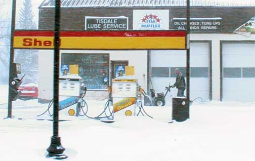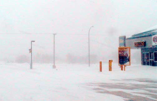 later it was difficult to see across the street. CBC's morning show had pointed out the serious nature of the storm in the Saskatoon area and that it was to spread across the province north of the Yellowhead highway. Clearly, everyone had taken heed of the advance warning and Tisdale's school buses stayed at home. Just before two I drove downtown in a failed attempt to go for lunch at the new restaurant but indeed it and many other businesses closed for the day. It was like the middle of the night downtown with snow swirling around and one or two cars on the snow choked street. The grader was making a valiant attempt to keep the main streets open but through the afternoon a lot of snow was coming down and just as much swirling around with the north wind behind it so that as you can see in these pictures taken about 2:15 the visibility here in town was much less than a block. This storm is one of those transistional storms between a strong low pressure area and warm southern air slamming up against a solid wall of cold air in Northern Saskatchewan. The high differential between the temperatures and the pressure produces the wild wind that is busy transporting the newly falling snow. It was interesting to note that the temperature in the southern part of the province remained just below freezing while here in Tisdale the temperature remained around -21º all day. Apparently it is really much colder north as during the night we should see the snow stop falling, the wind go down and the thermometer head for the bottom. With the very warm water in the Gulf of Alaska storms of this type are likely to be repeated as wet warm air chugs over the mountains and encounters slabs over frigid arctic air over the northern prairies. This is an El Nimo year (the last El Nimo was in 1998) and though that is suppose to produce very dry conditions at this latitude as it did the last time it occured there is no reason for that pattern to be repeated as the intensity of the warm Pacific current that flows along the equator and then turns north up the West Coast is substantial higher that it has been in the past. We can expect some normal winter weather for the next week and at any time another bit of a storm might just roll on in from the west. |