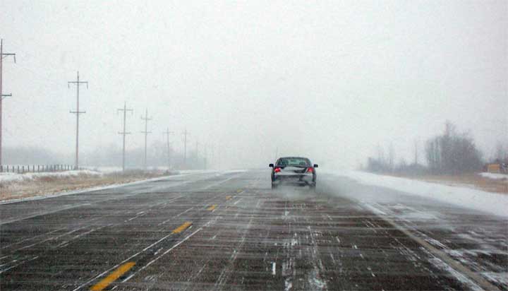 the go. It took about twice the normal time to get from Elfros to Yorkton and by then the accumulation of snow on the road surface exceeded safe limits and I decided to spend the night in Yorkton. I parked the van in the parking lot at midnight and you can see the amount of snow on it the following morning (above). Yorkton was busy digging out of the downfall and it was still snowing when I headed off down the Yellowhead around ten in the morning (above). Most of the road was clear like this though visibility was often limited. Traffic however, moved along nicely and it was a safe trip over to Neepawa for lunch and I was in Winnipeg at 4:00. |